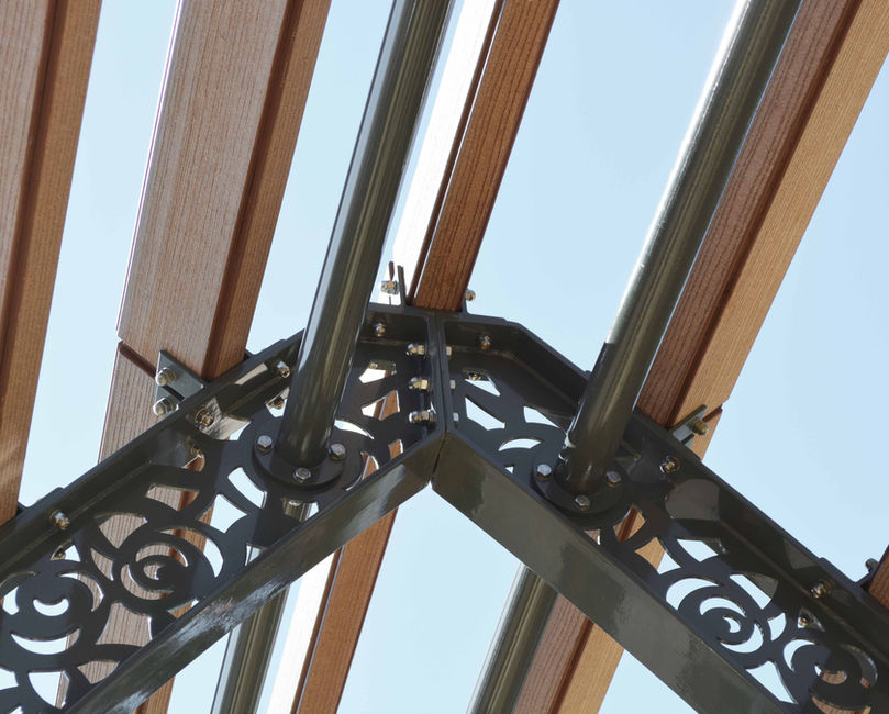 Each arch is constructed out of 10mm thick steel sheets which have been laser cut with a design derived from a bunch of roses allowing enough penetrations give a sense of overall lightness without compromising on the structural integrity and purpose.