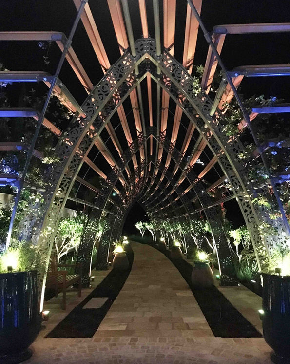 Strict position of upward lighting at every access highlights the journey along the pergola and creates a play with shadows through the crawling greenery above.