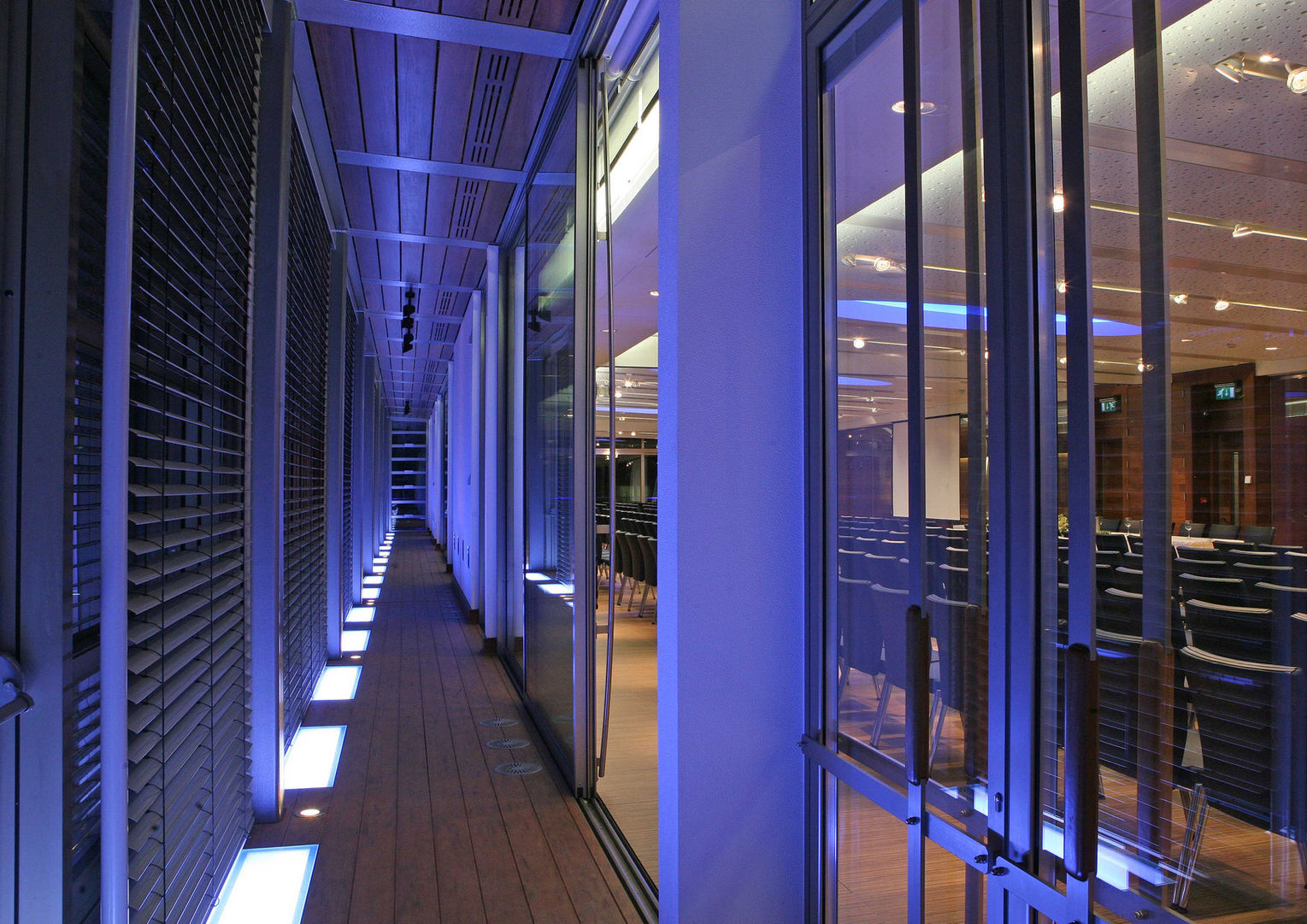 The layout of the venue allows for easy division into four smaller chambers, offering adaptability for different functions. A double skin facade with floor to ceiling glazing protects the interior from the intense direct sunlight especially during the summer months with louvered vents which exhaust the hot air allowing the interior environment to remain at cool constant temperature.